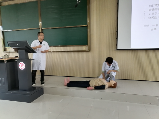 活动伊始,安康市中医医院的医疗团队便针对急救的基本原则以及核心方法进行了详细阐述。接着,急诊医学科米俊医师利用医用模拟人偶,对心肺复苏术的具体实施步骤进行了现场演示,细致入微地讲解了按压的技巧、频率以及所需力度。随后,特别邀请两位同学上台,进行一对一的实践教学,彰显“人人学急救,急救为人人”的深刻理念。急诊科储易亮大夫为众人介绍了“海姆立克急救法”的精髓,并亲自进行现场示范,医护人员通过生动的情景模拟和详细的步骤讲解,教会大家如何在关键时刻利用海姆立克急救法挽救生命。最后,安康市中医医院的医疗团队与本院学子共同合影留念。
