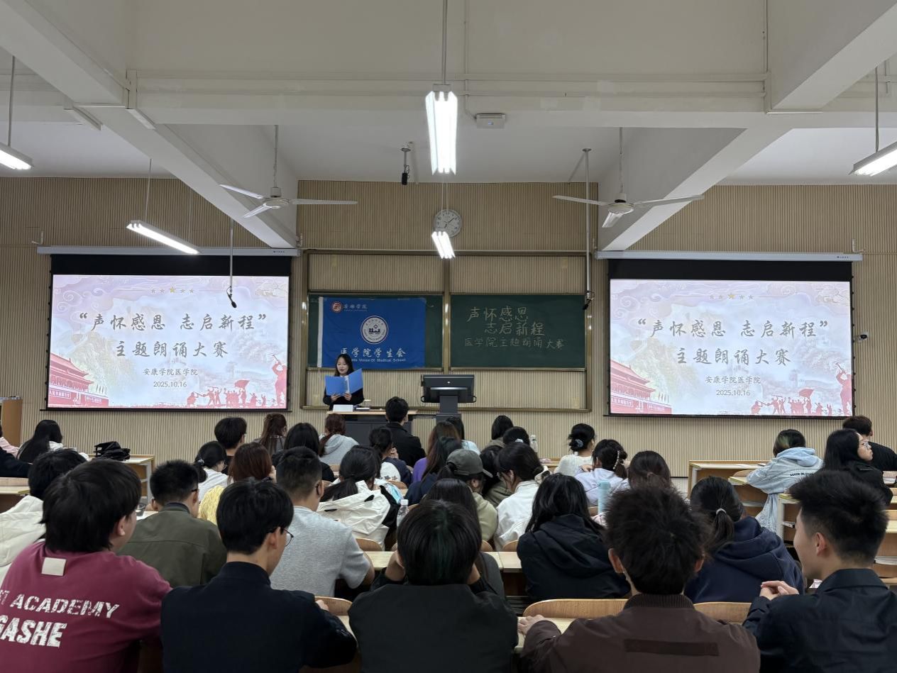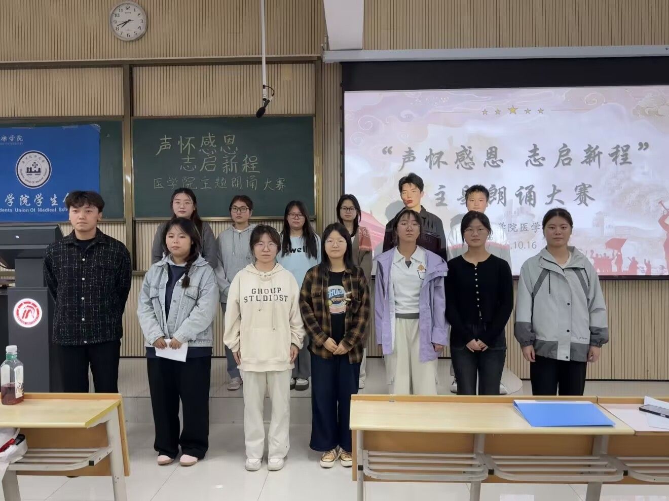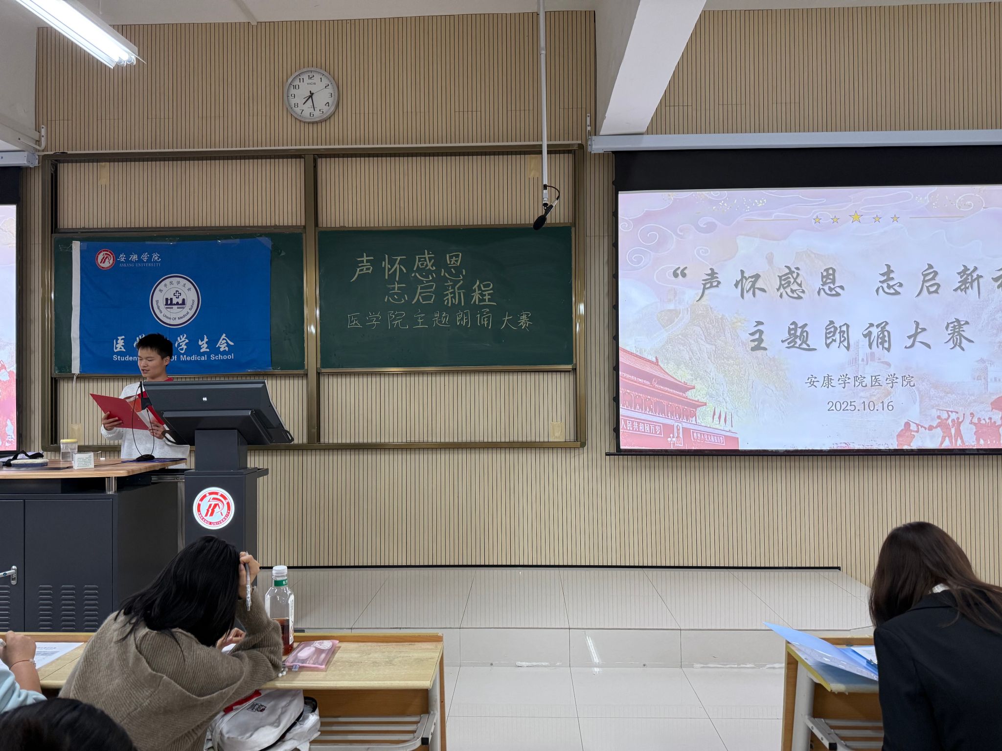 为厚植感恩情怀,凝聚奋进力量,韦德体育于10月16日举办以“声怀感恩,志启新程”为主题的朗诵比赛,本次比赛由2025级康复治疗学2班张乐轩主持。