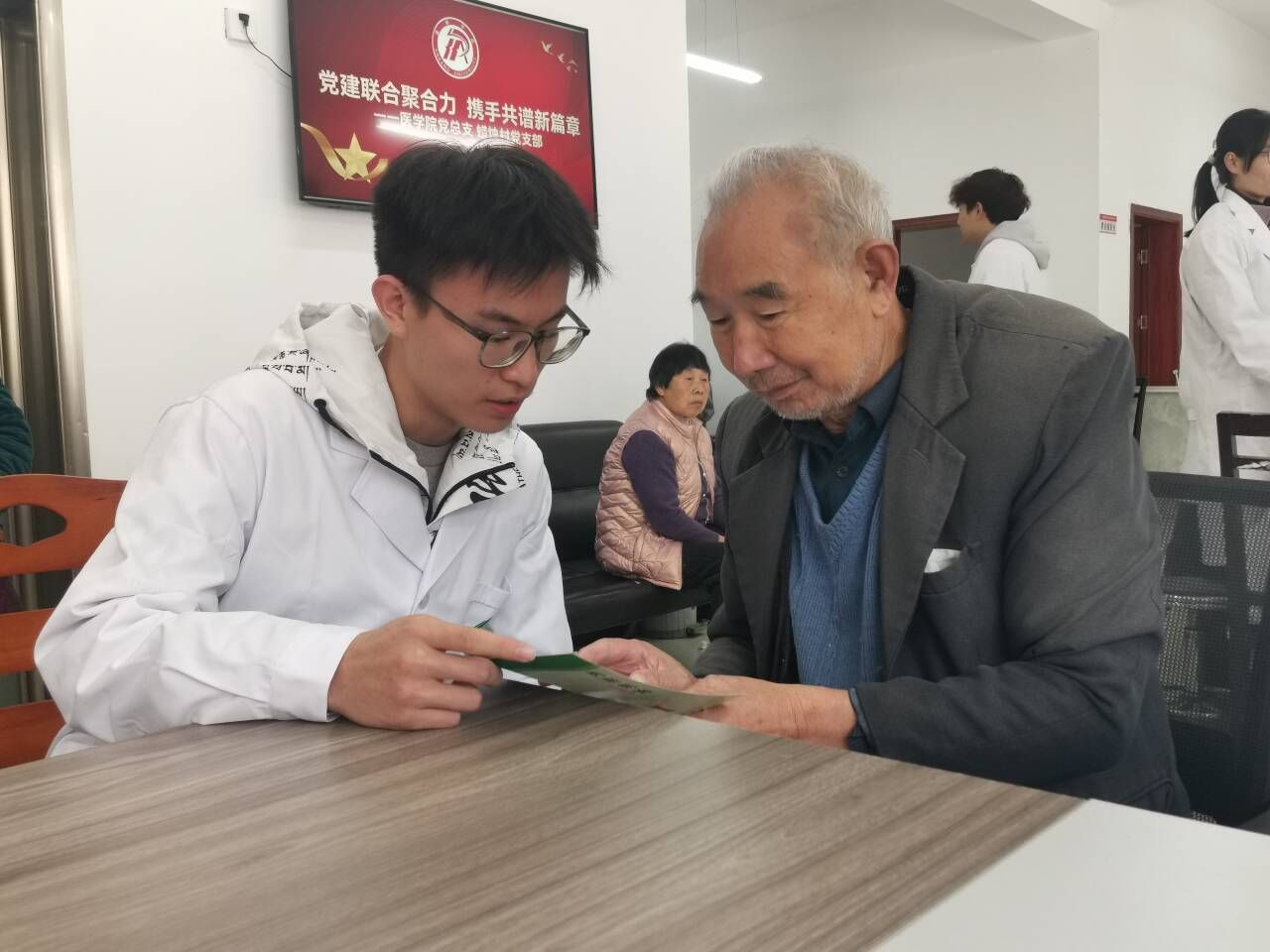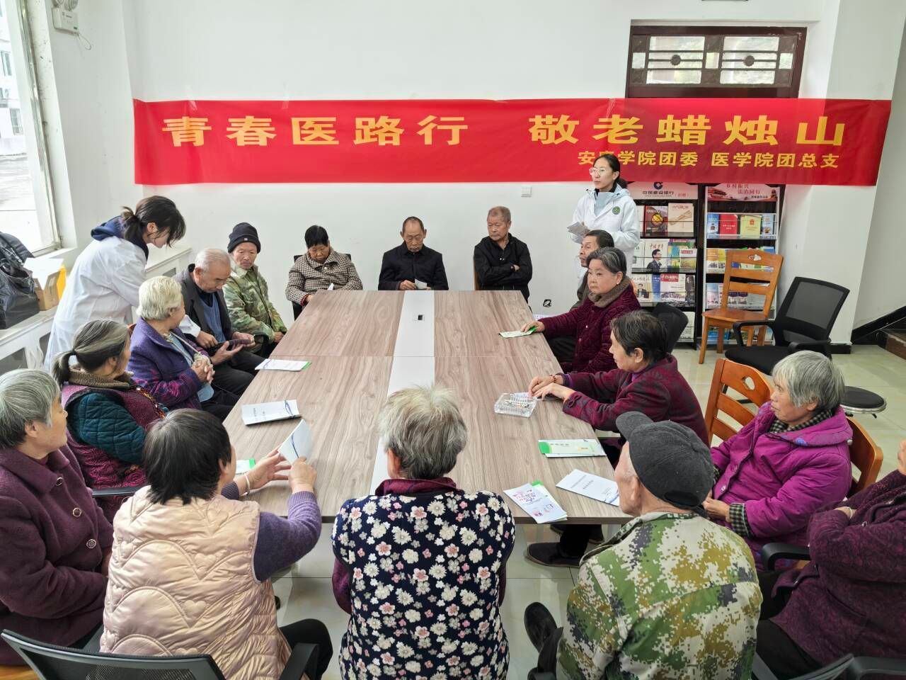 活动现场分工明确、秩序井然。环节一:健康检测。专业老师和同学们协助老师为老人逐一测量血压、血糖,对指标异常者耐心讲解注意事项,并再三叮嘱定期就医复查;环节二:健康宣讲。邹婷老师带领3名员工以“拉家常”式语言开展健康宣讲,围绕高血压、糖尿病饮食禁忌,秋冬季流感、支气管炎预防,以及过期药品识别与处理等内容,让老人们轻松掌握实用知识。环节三:反诈宣讲。青年志愿者服务队则聚焦涉老诈骗高发领域,通过剖析“冒充子女借钱”“高息养老理财”等真实案例,详解电信网络诈骗与非法金融陷阱的防范要点,同步普及老年人权益保障法。